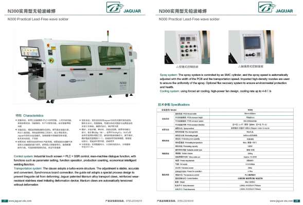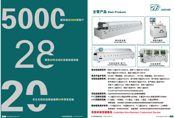 经过数年的快速发展,捷豹自动化已经摸索出适合自己的经营模式,各项业务迅速发展壮大,走在了国内无铅电子设备制造行业的前沿。引进欧美、日本、台湾等先进技术,开发出产品有无铅回流焊系列、无铅波峰焊机系列、贴片机系列、自动插件机、生产线系列、SMT辅助设备系列等多个系列无铅设备及其配套产品。其中,无铅回流焊,波峰焊为多类型电子制造企业提供省心的SMT设备方案,以更强大的产品功能、更优异的设备品质、更完善的一站式服务满足客户更多的需求。广泛应用于电子电路、集成电路、仪器仪表、印制电路、计算机制造、手机通讯、汽车电子、精密器械、LED照明、LED显示、电子电器、玩具制造、印刷制版等行业。