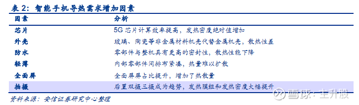 总体来看,芯片处理能力、射频功耗、机壳材质和轻薄化的设计是影响手机散热需求的主要因素。一方面,随着智能手机的发展,手机芯片的主频越来越高,功率越来越大。5G 芯片处理能力是现有芯片的 5 倍;5G 手机总功率约 9.6W,是4G 的 2 倍;5G 手机运行在多频段和高频网络,Massive MIMO(大规模多入多出)天线技术商用,耗能是 4G 芯片的 2.5倍;加上高速处理大量数据,同时手机视频内容、游戏内容等的高清化。