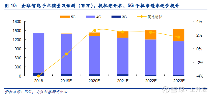 除了单价 ASP 的倍增外,智能手机出货量有望借力于 5G实现大幅增长。根据 IDC 发布的报告,预计 2019 年全球智能手机出货量仍延续下滑趋势,同比下降0.8%,达到 13.9 亿部。但随着可折叠屏和 5G 手机的商用,2019 年下半年智能手机行业有望恢复增长,预估该趋势将一直延续到 2023 年,届时全球智能手机出货量将达到 15.42 亿台,其中 5G 手机渗透率达到 25%。