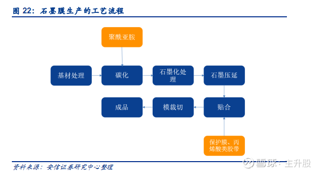 智能手机中广泛使用的人工石墨散热膜是由聚酰亚胺(PI膜)经过碳化和石墨化制成的。从生产工艺的角度来说,主要经过 6 道工序,依次是基材处理、碳化、石墨化、压延、贴合、模切。其中,碳化指的是高温下将 PI 膜的结构分子径向排列打乱,羰基断裂,非碳成分全部或大部分挥发,最后形成乱层结构的聚酰亚胺碳化膜(一种多环化合物)。石墨化则是进一步在高温下将多环化合物分子重整,有序性增大,无序性减少,向六角平面的层状石墨结构转变,最后形成高结晶度的大面积石墨原膜。碳化和石墨化之后,再经过压延(挤压延展形成柔软且高密度的石墨原膜)、贴合(在上下表面贴覆离型膜和保护膜)和模切(加工和切割使材料定制零部件),最终形成满足需求的高导热石墨膜成品。