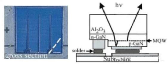 针对传统正装LED存在的散热差、透明电极电流分布不均匀、表面电极焊盘和引线挡光以及金线导致的可靠性问题,1998年,J.J.Wierer等人制备出了1W倒装焊接结构的大功率AlGaInN-LED蓝光芯片,他们将金属化凸点的AIGalnN芯片倒装焊接在具有防静电保护二极管(ESD)的硅载体上。