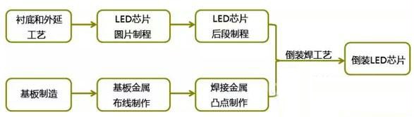 倒装LED芯片的制作工艺流程,如图4所示,总体上可以分为LED芯片制作和基板制造两条线,芯片和基板制造完成后,将LED芯片倒装焊接在基板表面上,形成倒装LED芯片。