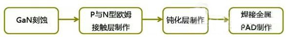 倒装芯片与正装芯片的圆片制作过程大致相同,都需要在外延层上进行刻蚀,露出下层的N型GaN;然后在P和N极上分别制作出欧姆接触电极,再在芯片表面制作钝化保护层,最后制作焊接用的金属焊盘,其制作流程如图5所示。