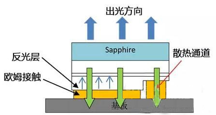 与正装芯片相比,倒装芯片需要制作成电极朝下的结构。这种特殊的结构,使得倒装芯片在一些工艺步骤上有特殊的需求,如欧姆接触层必须具有高反射率,使得射向芯片电极表面的光能够尽量多的反射回蓝宝石的一面,以保证良好的出光效率。