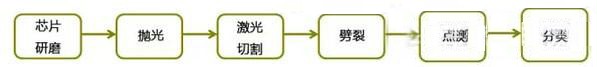 与正装LED芯片一样,圆片工艺制程后,还包括芯片后段的工艺制程,其工艺流程如图7所示,主要包括研磨、抛光、切割、劈裂、测试和分类等工序。这里工序中,唯一有不同的是测试工序,其它工序基本与正装芯片完全相同,这里不再赘述。