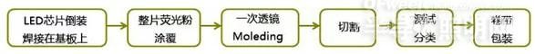这一封装形式是先将倒装芯片焊接(Bonding)在陶瓷基板上,再进行荧光粉的涂覆,最后用铸模(Molding)的方法制作一次透镜,这一方法将LED芯片和封装工艺结合起来,降低了成本。