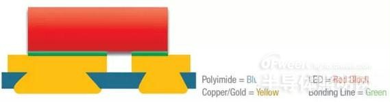 现在市面上出现了新型的LED光源,这种光源的结构中,使用柔性基板代替陶瓷基板作为倒装芯片的支撑,见图12。这种结构中,最主要的是用聚酰亚胺(Polyimide)等材料代替陶瓷作为支撑,用铜片作为导电和导热的材料。