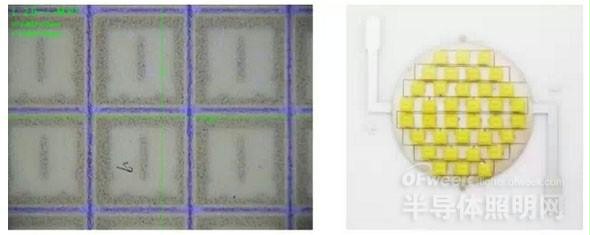 在直接贴装DA芯片基础上,2013年开始发展出了白光芯片(部分公司称为免封装或无封装)产品,如图6所示。它是在倒装DA芯片制造过程中同时完成了荧光粉的涂敷,应用时可在PCB上直接进行贴片,完全可以当作封装光源直接应用。
