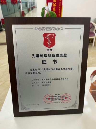 创新是支撑企业发展的不竭动力。近年来,捷豹自动化始终致力于回流焊波峰焊领域的自主研发,经过数年潜心耕耘,从零开始的框架搭建到设备成型后的调试改进,期间不断的完善产品细节,优化产品缺陷。在捷豹人贯彻着携手并进,秉持着风雨同舟的精神下,最终“十年磨一剑,一招试锋芒”,真空回流焊(VR-1200-N)凭借扎实的产品基础荣获该奖。