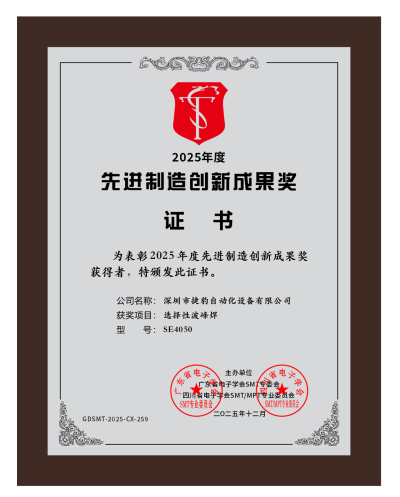 而在这场盛会里,捷豹自动化直接凭实力 “C 位出道”—— 不仅受邀重磅亮相,更在同期颁奖典礼上,凭选择性波峰焊(型号 SE4050) 斩获 “2025 年度先进制造创新成果奖”!